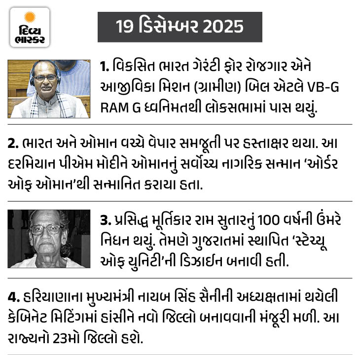 .ગઈકાલના મોટા સમાચાર મનરેગામાંથી ગાંધીજીનું નામ હટાવવા સંબંધિત બિલને લઈને રહ્યા. આ બિલ લોકસભામાં પસાર થઈ ગયું છે. બીજા સમાચાર ચાંદી અંગેના છે, જે સતત બીજા દિવસે ₹2 લાખ રૂપિયાને પાર રહી.⏰ આજની ઈવેન્ટ્સ, જેના પર રહેશે નજર1. ગુજરાત અને તમિલનાડુમાં ડ્રાફ્ટ મતદાર યાદી પ્રકાશિત કરવામાં આવશે.2. પહેલી ડિસેમ્બરથી શરૂ થયેલા સંસદના શિયાળુ સત્રનો આજે છેલ્લો દિવસ છે.3. એપસ્ટીન કેસ સંબંધિત તમામ ઇમેઇલ્સ, ફોટા અને દસ્તાવેજો યુએસમાં જાહેર કરવામાં આવશે4. ભારત વિ દક્ષિણ આફ્રિકા T20I, અમદાવાદમાં સાંજે 7 વાગ્યે રમાશે📰 કાલના મોટા સમાચારો1. લોકસભામાં ‘VB- G RAM G’ બિલ પાસ:વિપક્ષે બિલની કોપી ફાડી કાગળો ફેંક્યા, શિવરાજે કહ્યું-‘મનરેગા’ પહેલા ‘નરેગા’ હતી, કોંગ્રેસે ચૂંટણીમાં ફાયદા માટે તેમાં મહાત્મા ગાંધીને જોડ્યાકૃષિ મંત્રી શિવરાજ સિંહ ચૌહાણે લોકસભામાં ભારત ગેરંટી ફોર એમ્પ્લોયમેન્ટ આજીવિકા મિશન (ગ્રામીણ) બિલ, VB-G રામ જી બિલ પર જવાબ આપ્યો. આ દરમિયાન, વિપક્ષે બિલ વિરુદ્ધ સૂત્રોચ્ચાર કરવાનું ચાલુ રાખ્યું. વિપક્ષના સાંસદોએ વેલમાં પહોંચી ગયા અને બિલની કોપી ફાડી કાગળો ફેંકાયા હતા.કેન્દ્રીય કૃષિ મંત્રી શિવરાજ સિંહ ચૌહાણે લોકસભામાં કહ્યું, “અમે કોઈની સાથે ભેદભાવ કરતા નથી. બાપુ અમારા પ્રેરણા અને આદર છે. આખો દેશ અમારા માટે એક છે. દેશ અમારા માટે ફક્ત જમીનનો ટુકડો નથી. અમારા વિચારો સંકુચિત કે મર્યાદિત નથી.” વાંચો સંપૂર્ણ સમાચાર2. સુપ્રીમ કોર્ટે કહ્યું-નિવૃત્તિ પહેલા ધડાધડ ચુકાદા સંભળાવવા દુર્ભાગ્યપૂર્ણ:એવું લાગે છે કે જજ મેચની છેલ્લી ઓવરમાં છગ્ગા મારી રહ્યા છેસુપ્રીમ કોર્ટે બુધવારે ન્યાયપાલિકામાં ભ્રષ્ટ આચરણને લઈને પરોક્ષ રીતે મહત્વપૂર્ણ ટિપ્પણી કરી હતી. કોર્ટે ભ્રષ્ટાચારનો ઉલ્લેખ કર્યા વિના કહ્યું કે નિવૃત્તિના બરાબર પહેલા ન્યાયાધીશોનું બાહ્ય કારણોથી પ્રભાવિત થઈને ઝડપથી ચુકાદાઓ આપવા દુર્ભાગ્યપૂર્ણ છે.ભારતના મુખ્ય ન્યાયાધીશ (CJI) સૂર્યકાંત, જસ્ટિસ જોયમાલ્યા બાગચી અને વિપુલ એમ પંચોલીની બેન્ચે કહ્યું- કેટલાક ન્યાયાધીશોમાં નિવૃત્તિના થોડા દિવસો પહેલા ખૂબ વધારે આદેશો પસાર કરવાની વૃત્તિ વધી રહી છે. તેઓ આદેશો એવી રીતે સંભળાવે છે જાણે મેચની છેલ્લી ઓવરમાં છગ્ગા મારી રહ્યા હોય. વાંચો સંપૂર્ણ સમાચાર3. ચાંદી ₹1,609 વધીને ₹2.01 લાખ પ્રતિ કિલો ઓલટાઇમ હાઈ:આ વર્ષે ચાંદીની કિંમત ₹1.15 લાખ વધી ચૂકી છે, સોનું 10 ગ્રામ ₹1.32 લાખ થયુંચાંદી આજે એટલે કે 18 ડિસેમ્બરે સતત બીજા દિવસે ઓલ ટાઈમ હાઈ પર પહોંચી ગઈ છે. ઇન્ડિયા બુલિયન એન્ડ જ્વેલર્સ એસોસિએશન (IBJA) અનુસાર, 1 કિલો ચાંદી 1,609 રૂપિયા વધીને 2,01,250 રૂપિયા પ્રતિ કિલો પર પહોંચી ગઈ છે. આ પહેલા 17 ડિસેમ્બરે તે 1,99,641 રૂપિયા પર બંધ થઈ હતી.જ્યારે ગઈકાલે ચાંદી પહેલીવાર 2 લાખ રૂપિયા પ્રતિ કિલોથી ઉપ