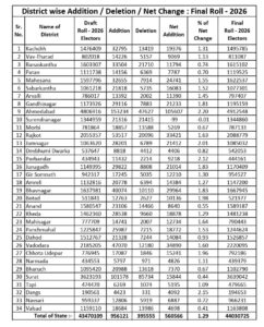 ભારતના ચૂંટણી પંચની સૂચના અનુસાર ગુજરાતમાં હાથ ધરવામાં આવેલી મતદાર યાદીની ખાસ સઘન સુધારણા ઝુંબેશ (SIR) પૂર્ણ થઈ છે. ગત 27 ઓક્ટોબર 2025થી શરૂ થયેલી આ પ્રક્રિયાના અંતે આજે (17 ફેબ્રુઆરી 2026) રાજ્યની આખરી મતદાર યાદી સત્તાવાર રીતે પ્રસિદ્ધ કરવામાં આવી છે. મુખ્ય નિર્વાચન અધિકારી હારીત શુક્લાએ આ પ્રસંગે જણાવ્યું હતું કે, આ ઝુંબેશને સફળ બનાવવા માટે રાજ્યભરમાં મિશન મોડ પર કામગીરી કરવામાં આવી હતી. પણ જે રીતે મતોને કમી કરાયા છે તેને લઇને કોંગ્રેસ અને આમ આદમી પાર્ટીએ સવાલો ઉભા કર્યા છે,