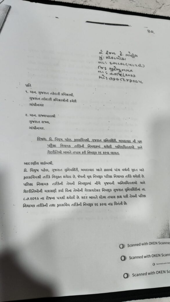 ગુજરાત યનુવર્સિટીના કુલપતિના લડકા રજીસ્ટ્રાર પિયુષ પટેલની લાયકને લઇને વિવાદ ઉઠ્યો છે, આ બાબતે વિજિલન્સ વિભાગમાં ફરિયાદ થઇ છે, ફરિયાદમાં સુરેન્દ્રનગરના ડો રંજનબેન ગોહિલે આરોપ લગાવ્યો છે કે પિયુષ પટેલ રજીસ્ટ્રાર બનવાની લાયકાત ધરાવતા નથી, તેઓએ ખોટા દસ્તાવેજો અને પુરાવા રજુ કરીને પરીક્ષા નિયામક તરીકે નોકરી મેળવી છે,તો તેમને હોદ્દા પરથી કાઢી મુકવા જોઇએ અને તેમની સામે પોલીસ કાર્યવાહી કરીને જેલ ભેગા કરવા જોઇએ,,