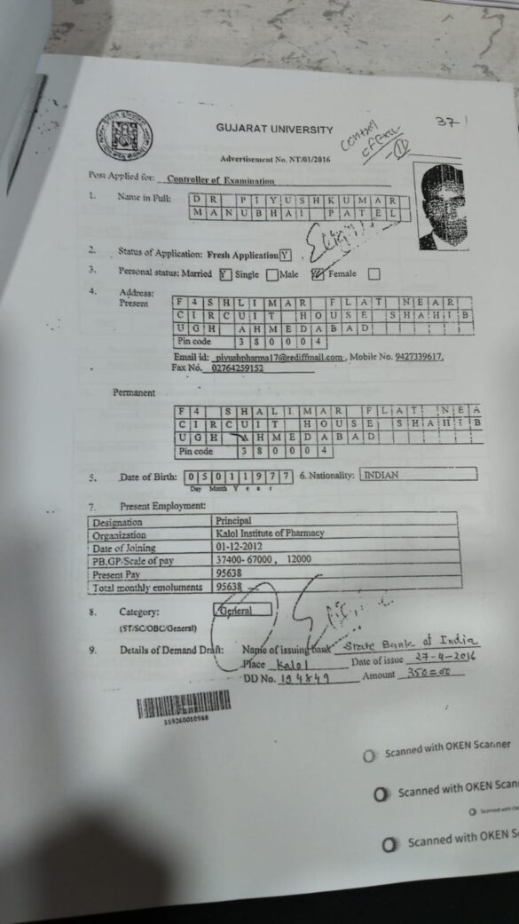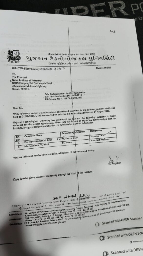 ફાર્માસ્યુટિકલ કાઉન્સિલ ઓફ ઇન્ડિયાના નિયમ મુજબ આસિસ્ટંટ પ્રોફેસર માટે પીએચડી હોવું ફરજિયાત છે, પણ જ્યારે તેઓએ આસિસ્ટંટ પ્રોફેસર માટે અરજી કરી હતી ત્યારે તમની પાસે પીએચડીની ડીગ્રી ન હતી, તેઓએ જુન 2006માં પીએચડીની ડીગ્રી મેળવી છે,એટલે તેમની આસિસ્ટંટ પ્રોફેસર તરીકેની નિમણુંક પણ સંપુર્ણ ગેર કાયદે છે, તે સિવાય અનેક ગેરરીતિઓ તેમની સામે આવી રહી છે, ત્યારે ગુજરાત યુનિવર્સિટીના સત્તાવાળાઓએ તેમને કોના દબાણ થી પરીક્ષા નિયામક બનાવ્યા અને ઇંચાર્જ રજીસ્ટ્રાર તરીકે ફરજ બજાવી રહ્યા છે, લાયકાત વગરના ઇંચાર્જ રજીસ્ટ્રાર અને પરીક્ષા નિયામકને ગુજરાત યુનિવર્સિટીમાં રાખવામાં કોને રસ છે, તે એક મોટો ચર્ચાનો વિષય છે, ભુતકાળમાં ઇંચાર્જ રજીસ્ટ્રાર પિયુષ પટેલને થોડાક સમય માટે રજીસ્ટ્રાર તરીકે હટાવી દેવામાં આવ્યા હતા, પણ પિયુષ પટેલેને રજીસ્ટ્રાર તરીકે પરત લાવવામાં ગુજરાત યુનિવર્સીટીના જ બે બોર્ડ ઓફ મેનેજમેન્ટના સભ્યોનો પીઠ્ઠુ તરીકે ઉપયોગ કરી કુલપતિના ઇશારે તત્કાલિન ઉચ્ચ શિક્ષણ મંત્રી રુષિકેશ પટેલની પાસે મોકલીને રાજકિય દબાણ કરાવી યુનિવર્સિટીમાં ફરીથી તાજપોશી કરાવી હતી, ત્યારે સવાલ ઉભો થાય છે કે બે પિઠ્ઠુઓ પૈકી એક પિઠ્ઠુ તો વિદાય થઇ ચુકી છે, જ્યારે બીજા યુનિવર્સિટીના સર્વે સર્વા છે તેવા સભ્યની નિમણુકના સમયે પણ વિવાદ થયો હતો, જે એક સમયે ગુજરાત ભાજપના નેતાના ખાસ અંગત હતા,