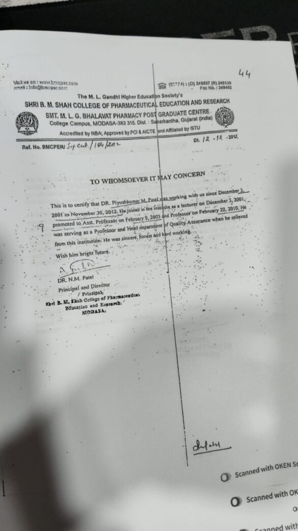 તે સિવાય તેમણે અનુભવમાં બીએમ કોલેજ ઓફ ફાર્માસ્યુકલ એજ્યુકેશન એન્ડ રીસર્ચ મોડાસા ખાતે લેક્ચરર તરીકે 3 ડીસેમ્બર 2001ના રોજ જોડાયા હતા, જ્યારે 12 ડીસેમ્બર 2012 સુધી કોલેજમાં નોકરી કરી છે, પણ આમાં એક પેંચ છે, કારણ કે પિયુષ પટેલે મોડાસાની કોલેજેમાં નોકરી આપવામા માટે ક્લેરિસ લાઇફ સાયન્સ લિમીટેડ નામની કંપનીનો અનુભવ પ્રમાણ પત્ર રજુ કર્યો છે, જેમાં તેઓએ 25 મે 2001 થી 15 ડીસેમ્બર 2001 સુધી સેવા આપી છે,, આમ તેઓ એક સાથે બે સંસ્થાઓમાં નોકરી કેવી રીતે હાજર રહીને નોકરી શકે છે,, શુ તેઓ મિસ્ટર ઇન્ડિયા છે, કે પછી કોઇ જાદુગર જે એક સમયે બે સ્થળો હાજર રહીને નોકરી પણ કરે ,,અને પગાર મેળવે,, તો પછી ભગવાન આવી તાકાત બીજા લોકોને કેમ નથી આપતા, ,,