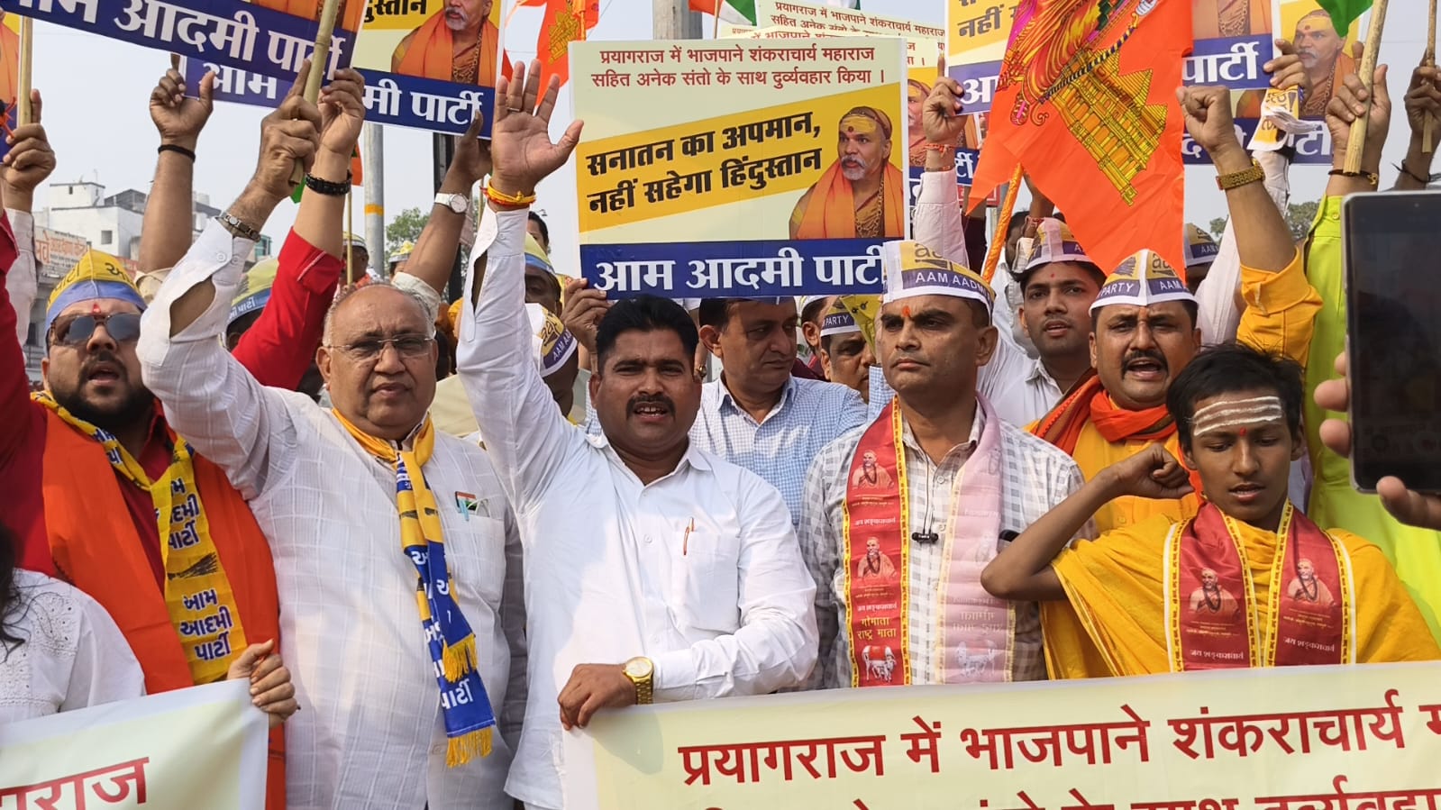 પ્રયાગરાજમાં ભાજપ સરકાર દ્વારા પૂજનીય જગદ્ગુરુ શંકરાચાર્ય મહારાજ અને સંતો ઉપર કરવામાં આવેલા હુમલાના વિરોધમાં સુરત શહેરમાં આમ આદમી પાર્ટીના મોટી સંખ્યામાં કાર્યકર્તાઓ રસ્તા પર ઉતરી આવ્યા હતા. આમ આદમી પાર્ટીએ આ ઘટનાને વિશ્વના તમામ હિંદુઓની આસ્થા પર થયેલો હુમલો ગણાવ્યો હતો. આમ આદમી પાર્ટીના નેતાઓએ જણાવ્યું હતું કે પૂજનીય જગદ્ગુરુ શંકરાચાર્ય મહારાજ સનાતન ધર્મનું ગૌરવ છે. જ્યોતિષપીઠના શંકરાચાર્ય શ્રી અવિમુક્તેશ્વરાનંદ મહારાજ વર્ષોથી ગૌરક્ષા કાયદા અને ગાયમાતાની રક્ષા માટે સંઘર્ષ કરી રહ્યા છે, જે બાબત ભાજપને અસહ્ય બની છે. આ કારણસર તેમના ઉપર અને સંતો ઉપર હુમલો કરવામાં આવ્યો હોવાનું આમ આદમી પાર્ટીએ આક્ષેપ કર્યો હતો.